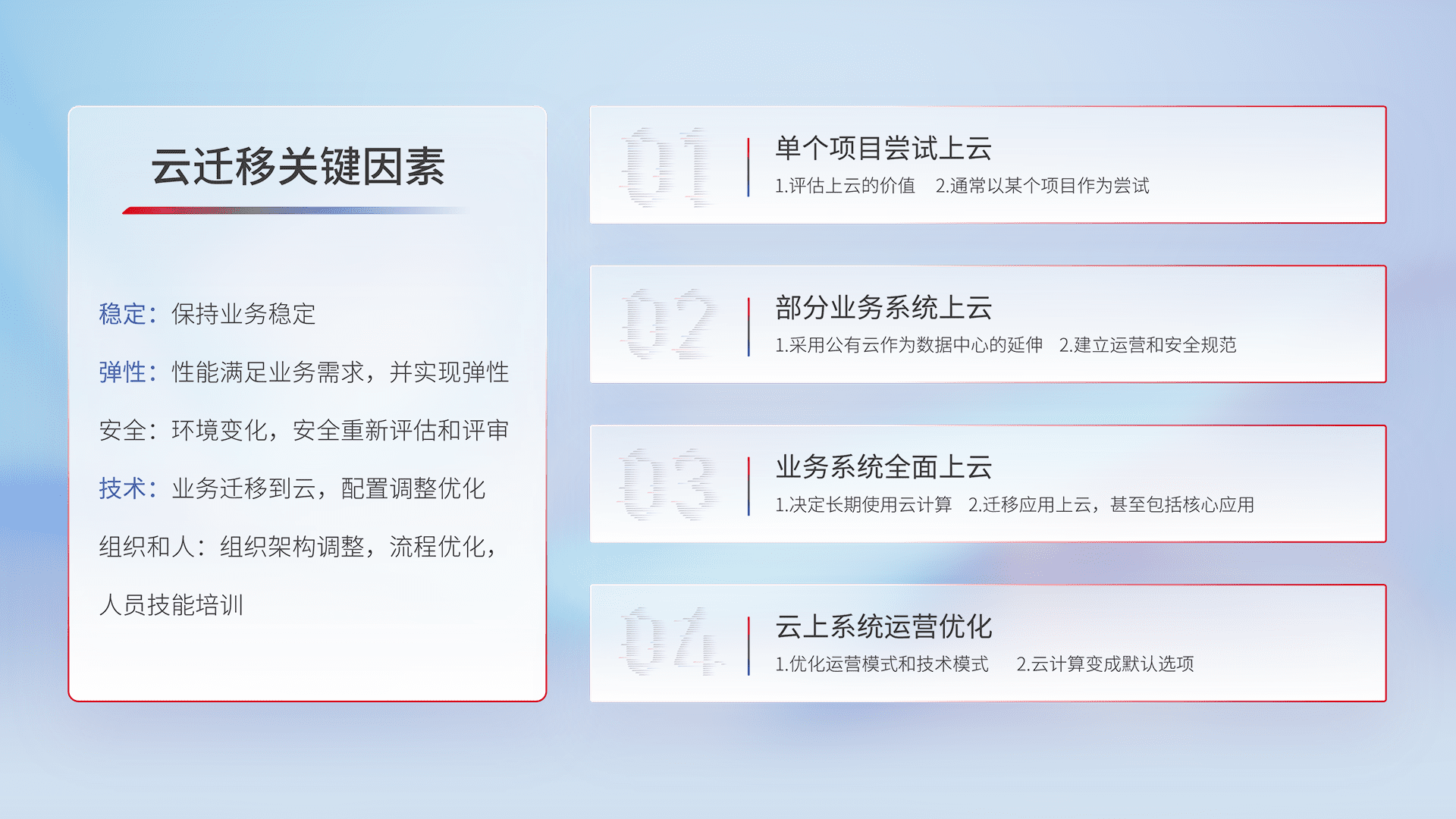 结合实际业务,,从规划设计、、云平台选型、、云原生改造、、数据迁移、、、集成交付,,迁移全过程为客户识别最佳上云路径,,做好风险识别管理,,,设计网络架构、、、、身份权限、、安全审计合规、、操作审计、、、日志审计、、监控告警策略、、多站点容灾设计等,,,对云上基础设施进行整体规划,,,提升IT治理水平,,,,以满足弹性、、高可用、、、、高性能的需求。。。。