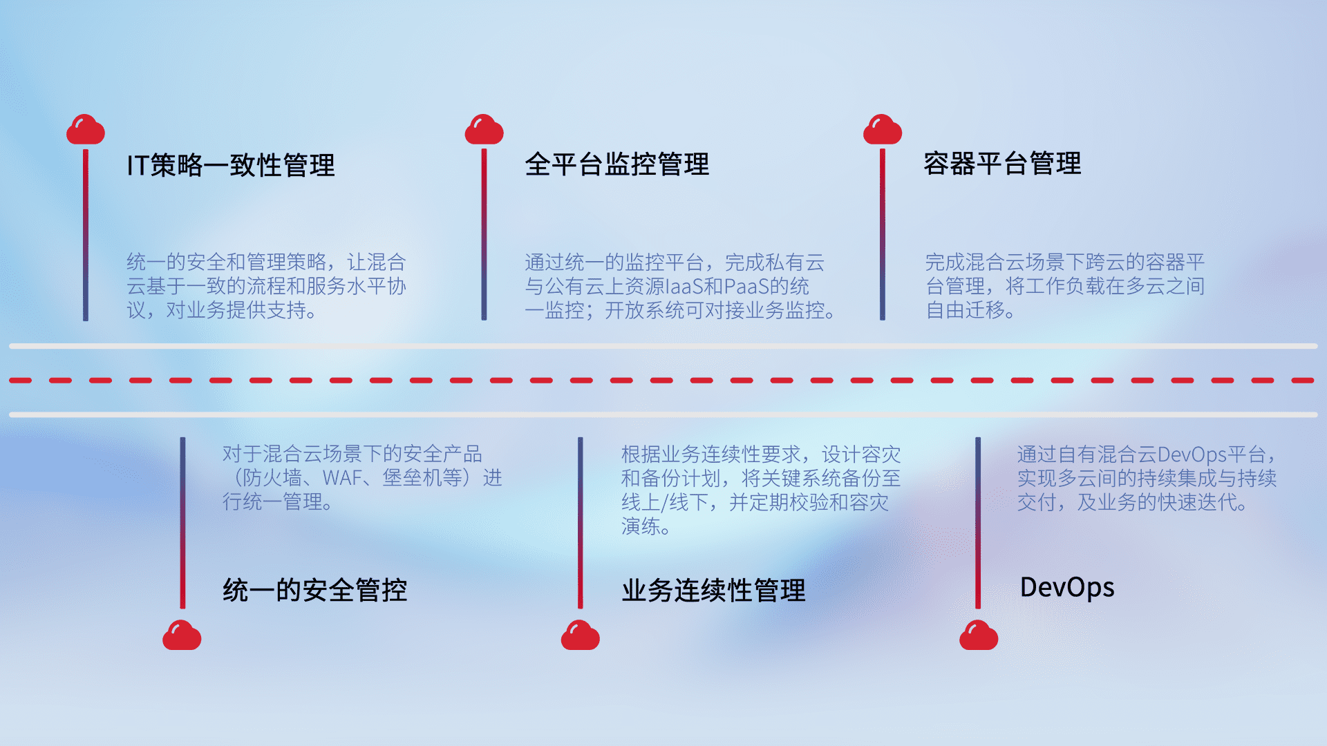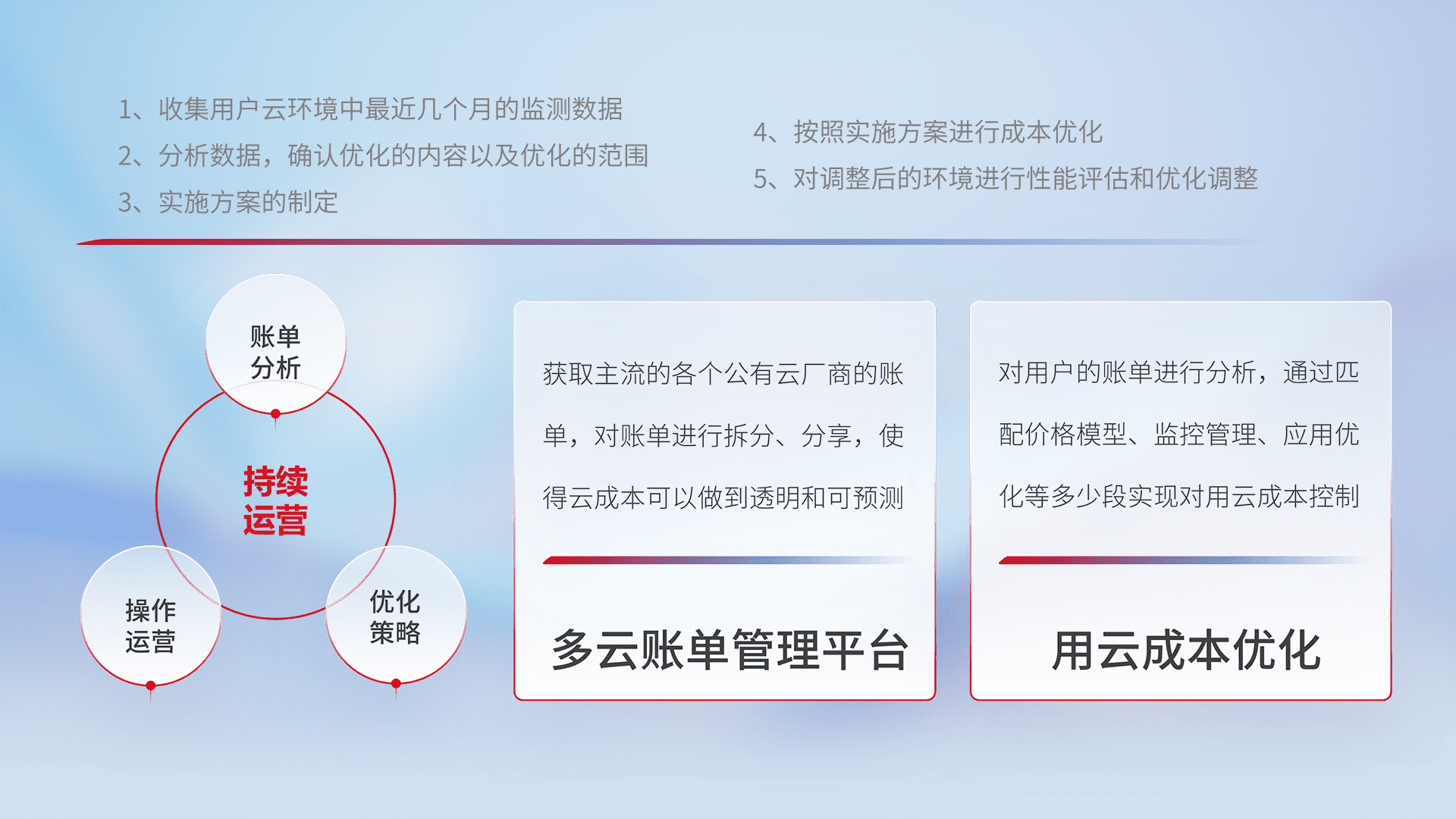 通过多云纳管,,以统一的资源数据模型把客户的云资源进行抽象和封装,,,进而实现对多云资源的统一操作,,保障云资源管理的可靠性、、稳定性与可用性。。。量身定制化运维内容,,,配置、、开发运维、、、、补丁管理、、、备份、、、监控、、、、认证和访问管理、、、审计和日常巡检等,,,保障在用云过程中的可靠度,,,,稳定度以及高可用率。。。。