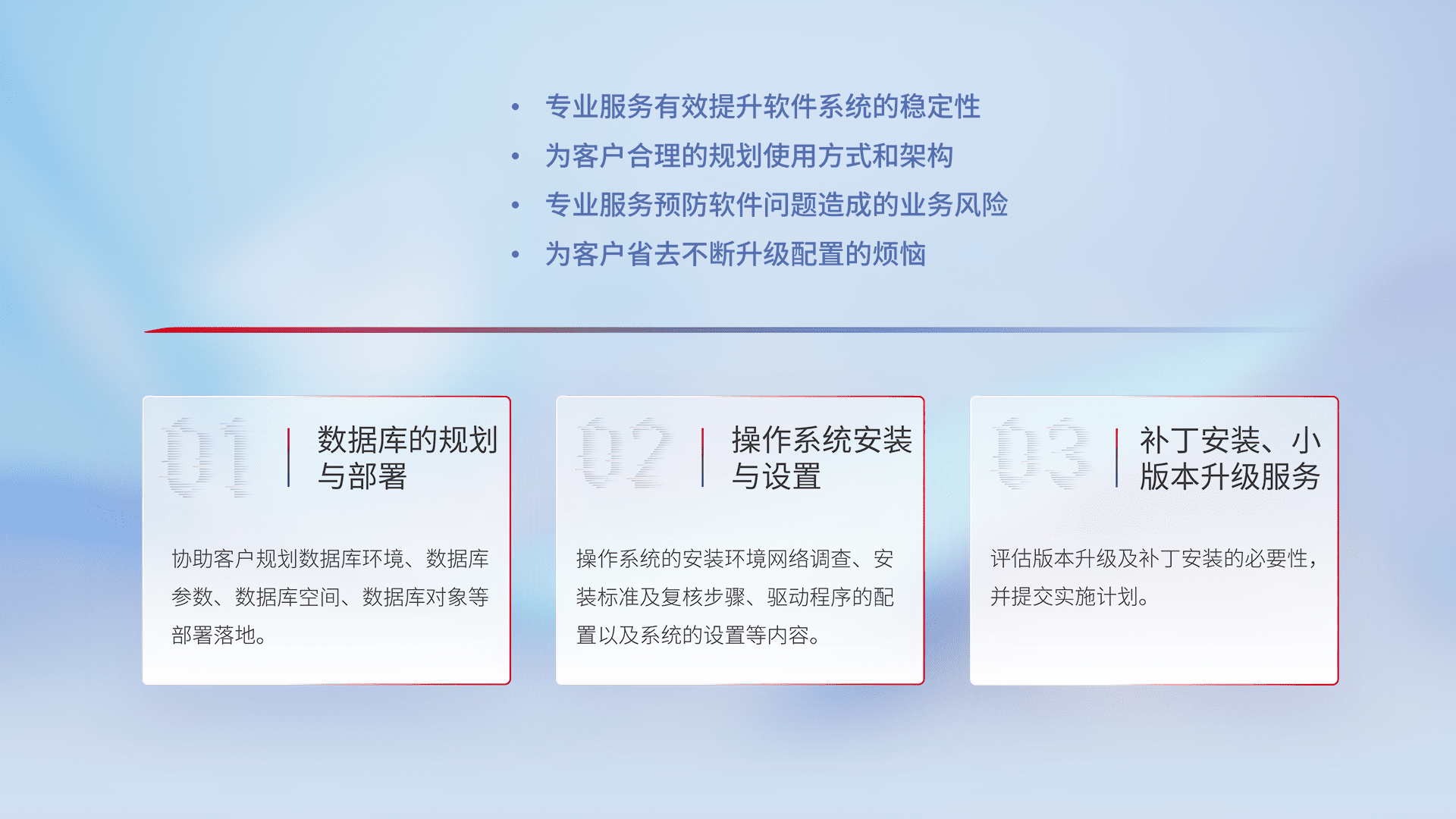 为客户提供软件规模升级、、、、快速部署、、按需配置的专业服务,,从数据库的规划与部署到操作系统的安装与设置,,,再到补丁安装和小版本升级提供支持。。。。